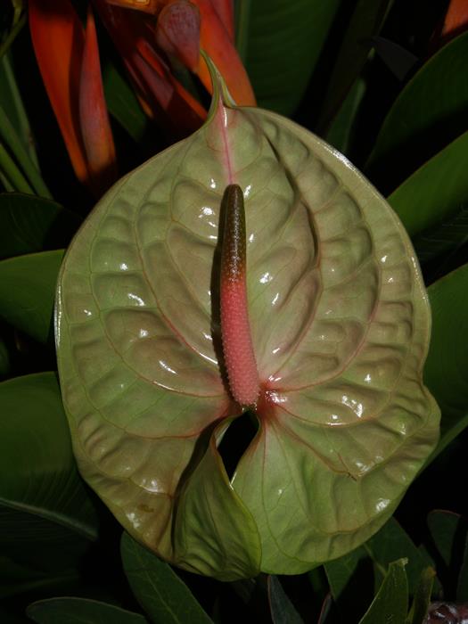 A. andreanum - Ovate leaves to 25cm long sit at the ends of long leaf stalks normally emerging from the base. Stems can eventually be more than 30cm long and flowers are commonly reddish. There are many varieties with different flower colours (even white).